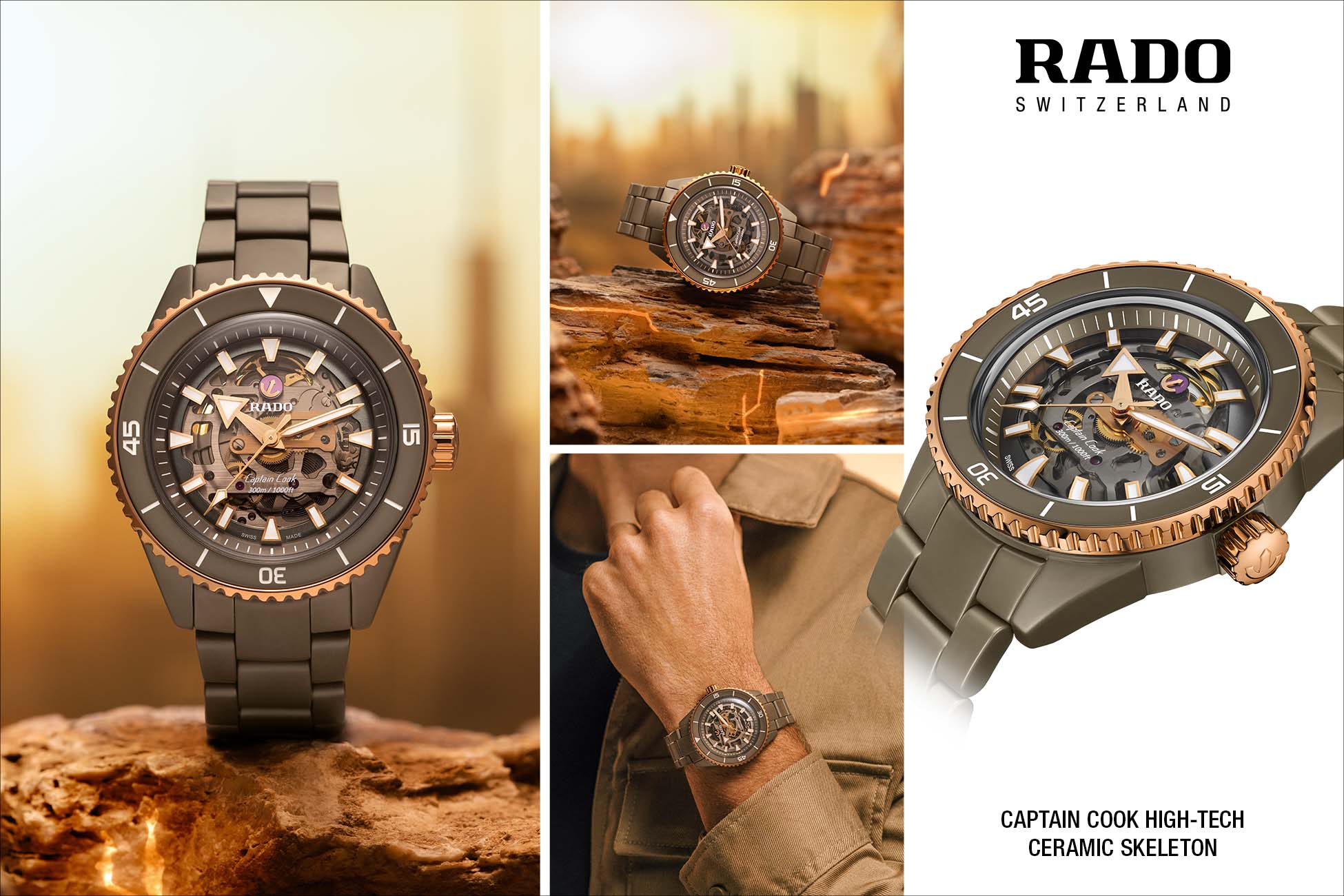 The Captain Cook High-Tech Ceramic Skeleton showcases its innovative R808 movement, a marvel of contrasts, know-how and clever geometry, that allows a distinct view of the various parts. It’s equipped with an anti-magnetic and highly reliable Nivachron™ hairspring that has been fully tested in five positions and provides up to 80 hours of power reserve. The superb matt olive-green high-tech ceramic monobloc case is topped by a rose-gold-colour rotatable bezel with a matt olive-green ceramic insert to match the case and lugs, for visual harmony.