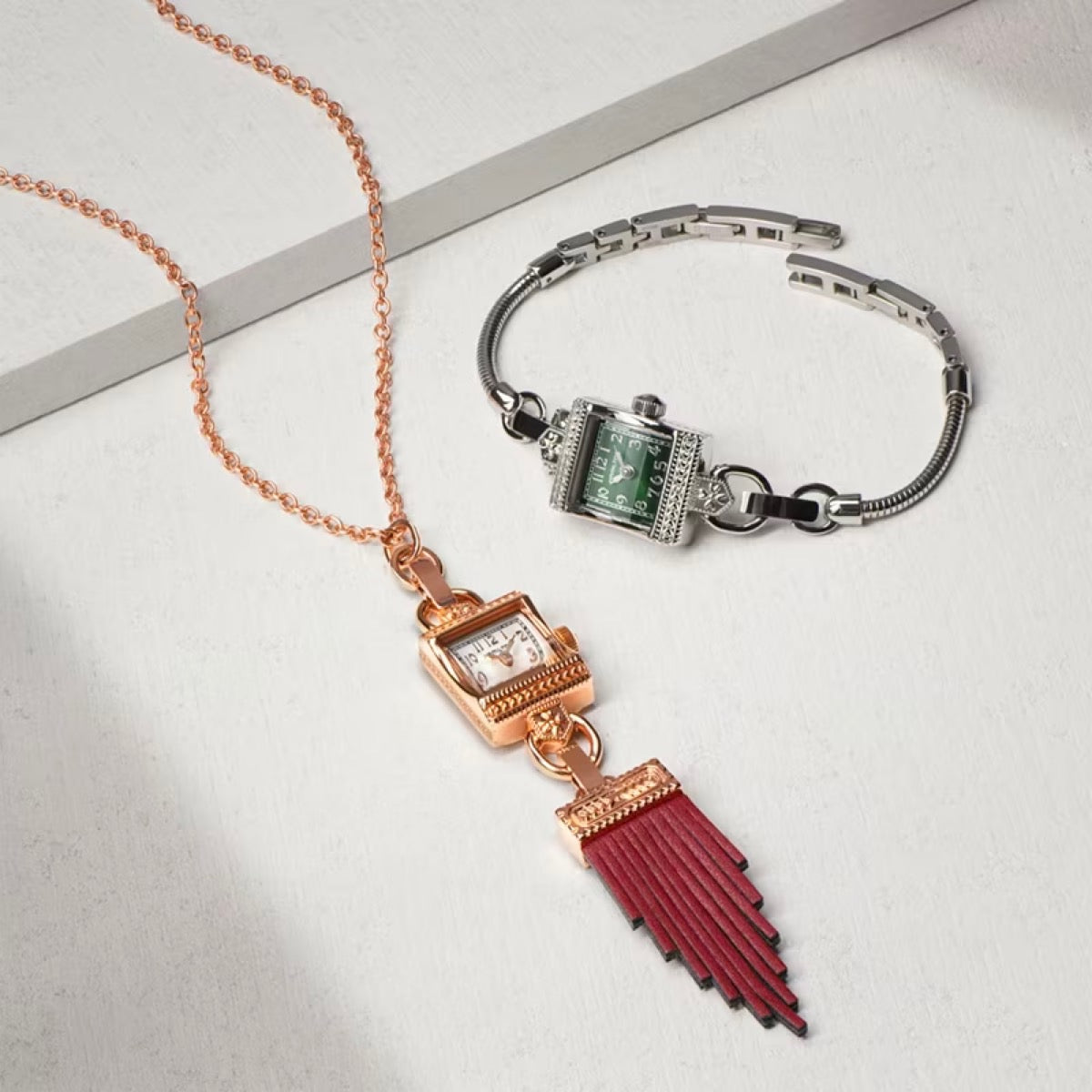 A watch and a piece of jewelry at once, the Lady Hamilton Necklace exemplifies the art deco aesthetic of the 1930's. Featuring a stainless steel case with an intricate decor and a green dial, this watch pendant can be worn as a timepiece paired with a chain bracelet or as a part of a necklace with adjustable chain and a fringed tassel pendant in forest green. All the set elements come together in special packaging inspired by the era’s iconic geometric patterns.